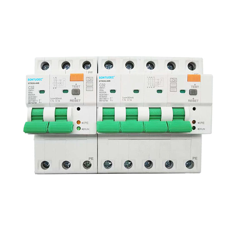 Protezione di perdita: RCBO STRO6-80B è in grado di rilevare la corrente residua (cioè la corrente di perdita) in un circuito. Quando la corrente residua supera la soglia impostata, l'interruttore di corrente residua del modello 4P RCBO B 4P taglierà il circuito in un periodo di tempo molto breve per prevenire incidenti elettrici e incendi elettrici.