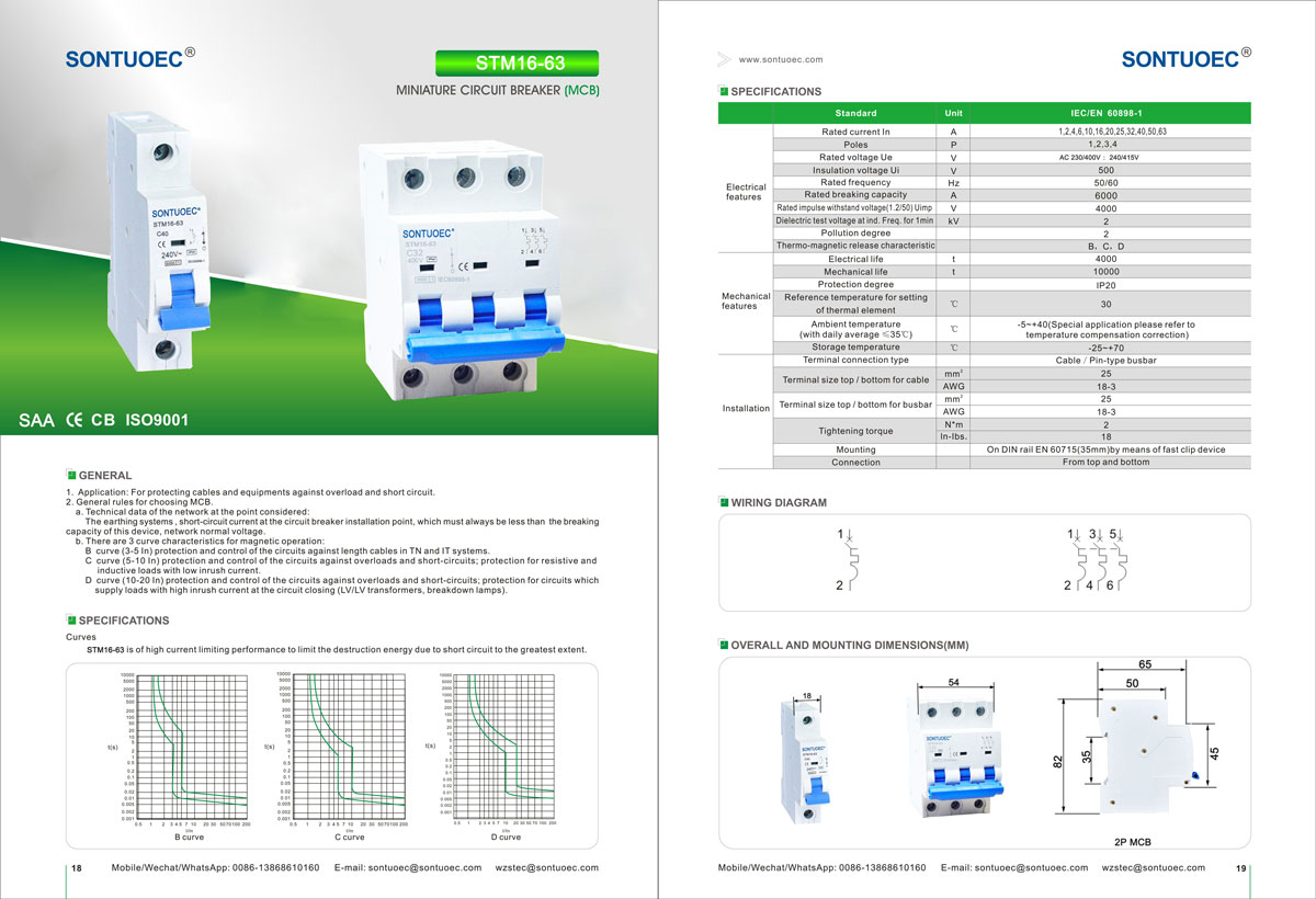 Sontuoec STM16-63 Interruttore di circuito in miniatura 6KA 1P 2P 4P 16A 230/400V Serie MCB L'interruttore in miniatura ad alta rottura ha le caratteristiche avanzate, le prestazioni affidabili, la capacità di rottura elevata, l'aspetto elegante e le sue parti sono realizzate in materiale con resistenza all'impatto, forti caratteristiche di ristrutturazione della fiamma. È adatto al sistema di alimentazione di AC 50/60Hz, tensione nominale di 230/400 V e corrente nominale fino a 63A. Viene applicato principalmente nell'edificio per uffici, residenza, per illuminazione, distribuzione di energia e sovraccarico e protezione del corto circuito delle attrezzature. Normalmente, può anche essere utilizzato come trasferimento non frequente del sistema di alimentazione. È conforme agli standard IEC60898-1.